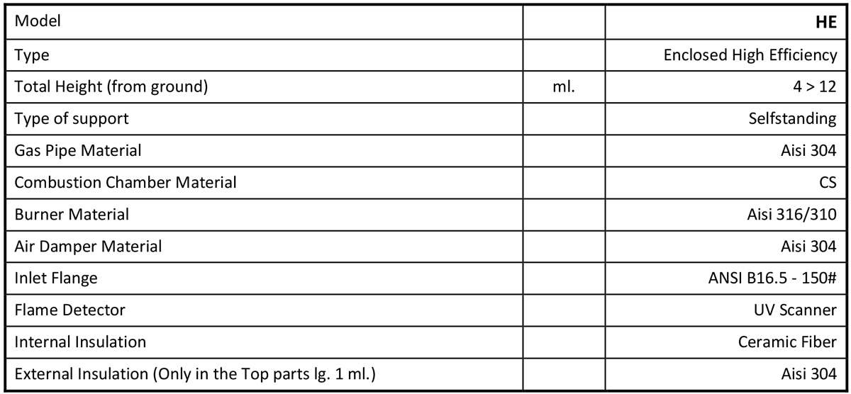 The high efficency flare consist of a burner installed at the base, equipped with a high-energy ignition Pilot and a flame detection system via UV scanner.