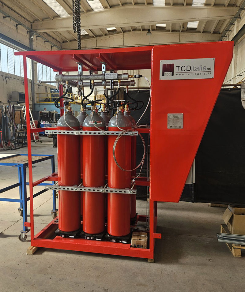 I segnali della termocoppia vengono inviati al pannello di controllo del sistema di spegnimento, dove vengono utilizzati interruttori di temperatura per avviare lo scarico rapido (è importante considerare che la velocità dell’agente di spegnimento all’uscita delle bottiglie è di circa 1 kg/s).